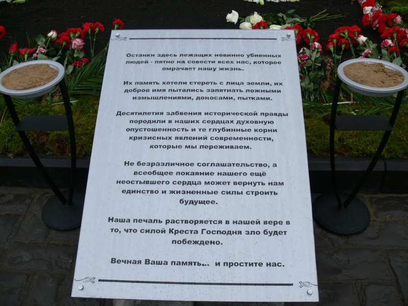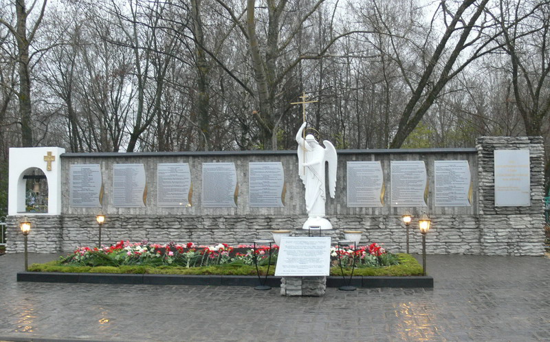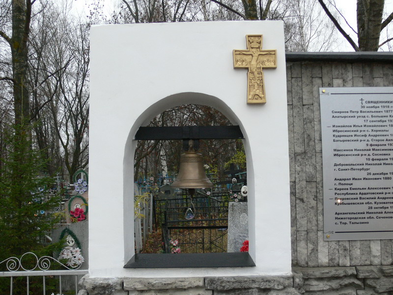In June-August 2009, on the initiative of the Cheboksary-Chuvash Diocese excavations were carried out there. The remains of 118 individuals were found, exhumed and subjected to forensic examination. The following year they were reburied in the Alatyr town cemetery next to the chapel of Russia’s New Martyrs and Confessors, part of the church of the Mother of God. On 30 October 2011 a memorial to the victims of political repression was inaugurated on the site of their reburial. The memorial includes a sculpture of the Mourning Angel, an arch with a bell and a Wall of Remembrance made up of eight boards bearing the names of those shot in Alatyr.