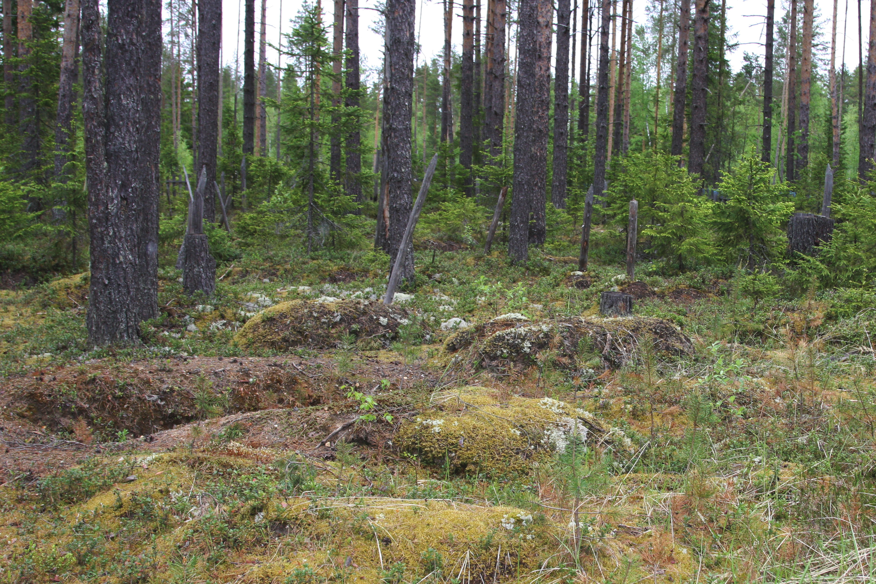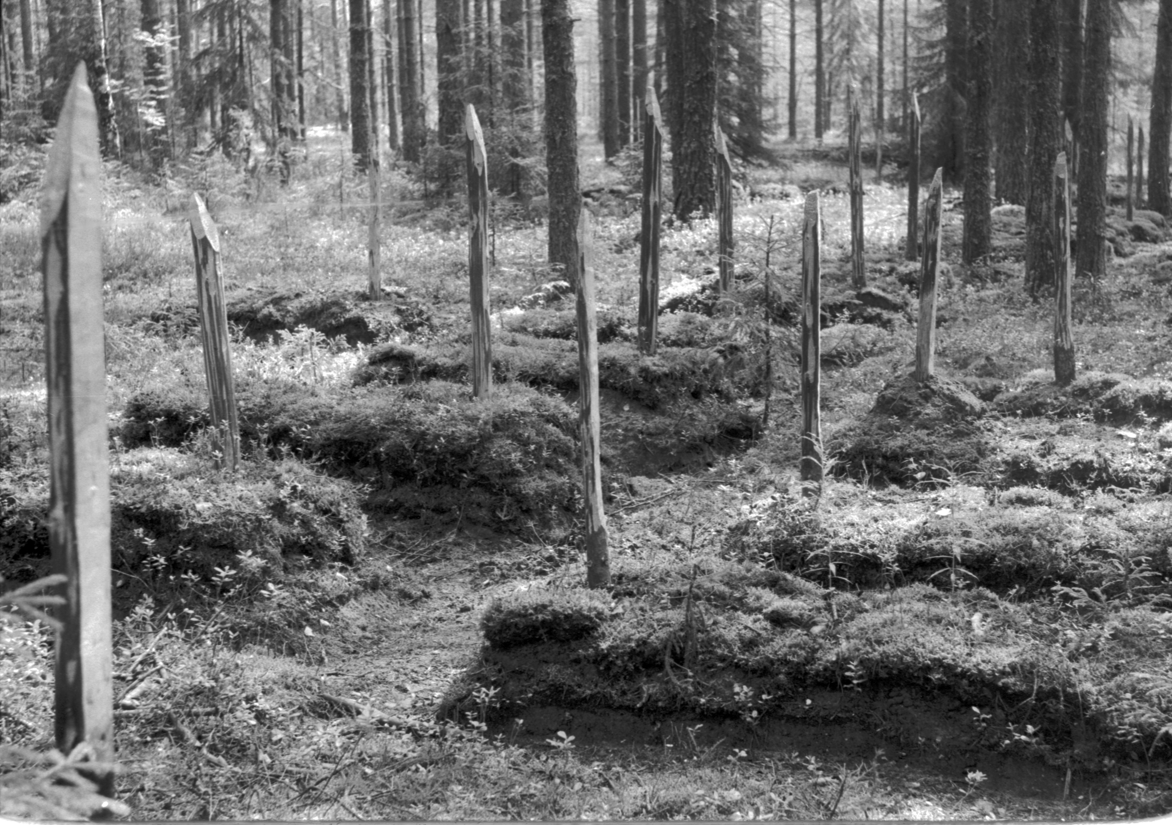 In the 1940s prisoners of the Sevdvinlag camps who died in the infirmary 3 kms away were buried here. The burial site was first discovered and investigated in 1989 by the explorers’ group from Velsk “In the Name of the Fallen”. They fenced off the cemetery with barbed wire and place a fir stake on each discovered burial. In the early 1990s they were able to prevent the development of a quarry on the site of the cemetery.