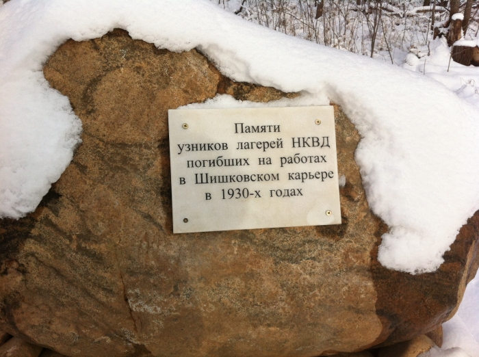 According to local inhabitants one of the camp cemeteries was not far from the village graveyard of Shishkovo-Dubrovo. On 30 October 2012, thanks to the Tver Memorial Society a commemorative monument was erected on that site. The text on the plaque reads: “In memory of the inmates of NKVD camps who died working at the Shishkovo quarry in the 1930s” (see photo). Next to the monument a metal Orthodox cross has been erected.